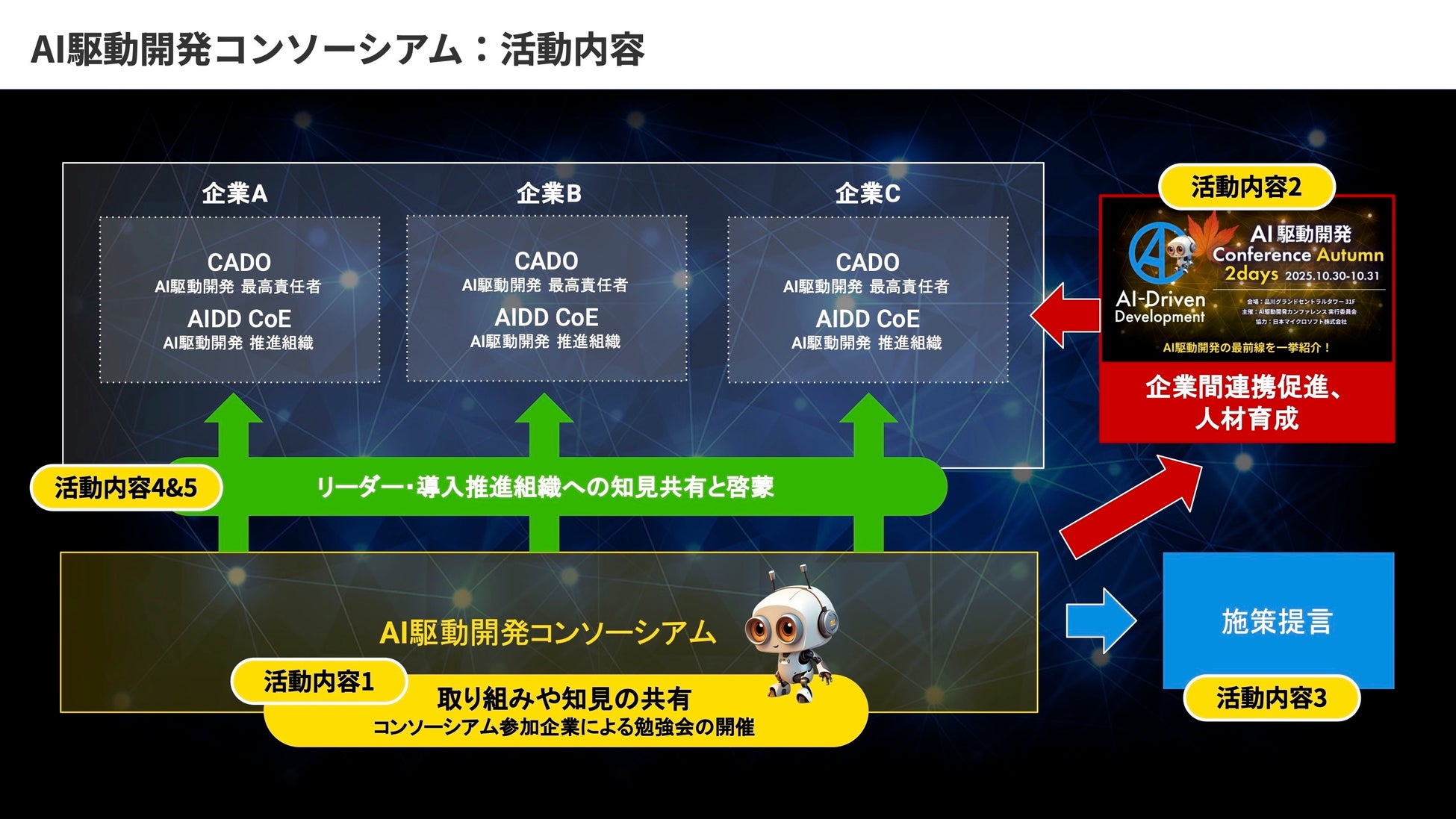 AI駆動開発コンソーシアムは、企業の枠を越えて「AI駆動開発」の啓蒙と知見共有を行い、日本企業全体の競争力強化とイノベーション創出に貢献することを目的としています。