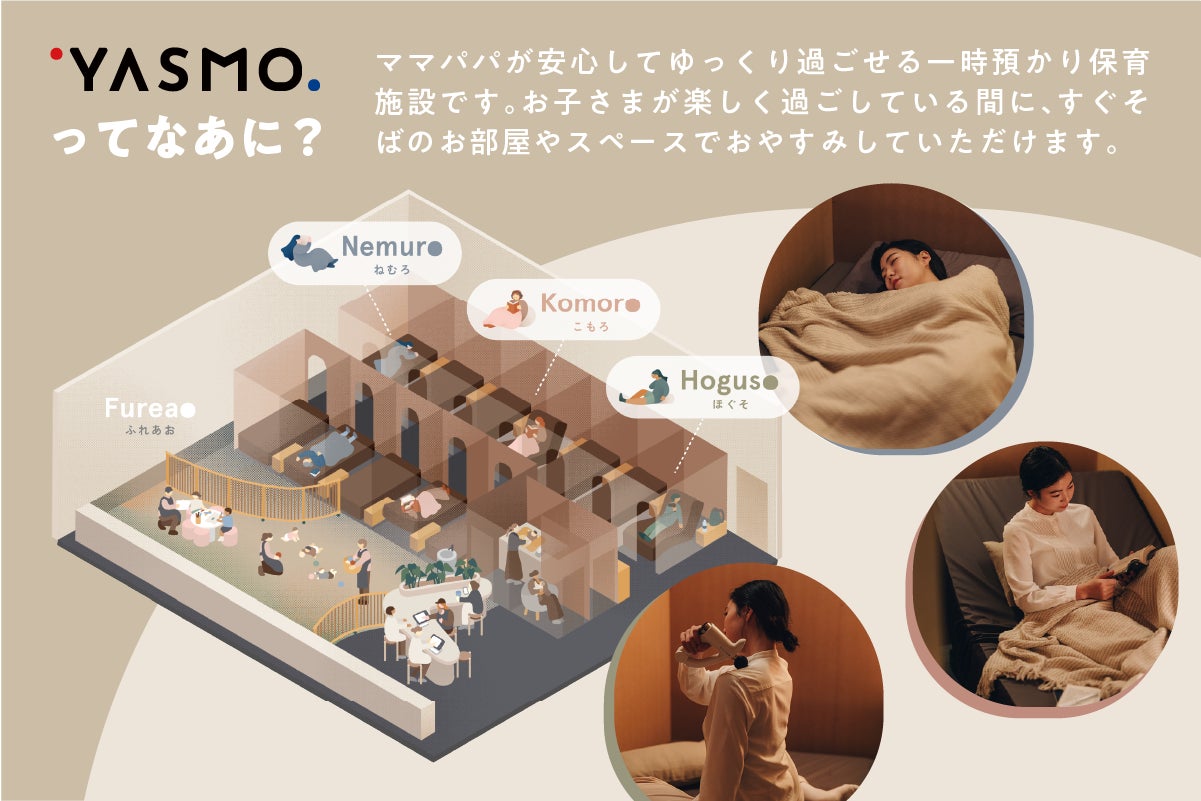 三井不動産グループの株式会社ShareTomorrowは、子育て中の親のうち多くが身体的・心理的負担を抱えているという社会課題を解決するために、ママパパ用休息室併設の一時預かり保育「YASMO」を運営しています。