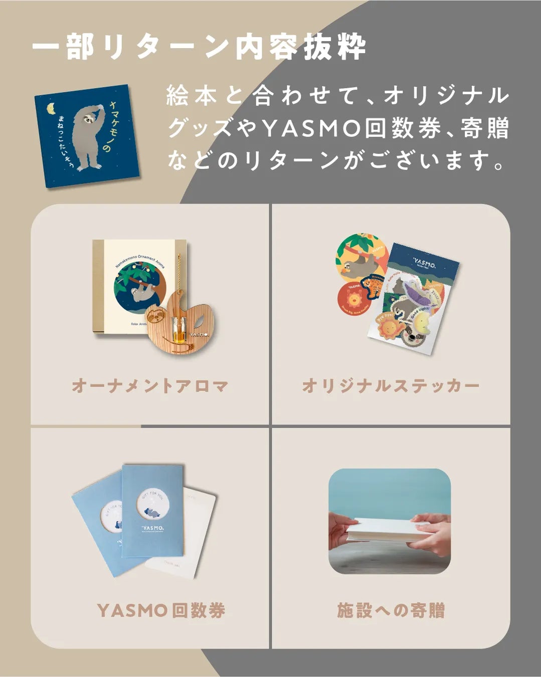 ご支援者さまには、絵本のリターンだけでなく、限定グッズであるキャラクターステッカーやオーナメントアロマのほか、ご自身のお名前が掲載される応援冊子など、魅力的な特典をご用意しております。さらに、図書館や子育て関連施設への寄贈を支援するプランや、YASMO Instagramでの回数券プレゼントキャンペーンへのスポンサープランなど、特別な応援も可能です。多様なプランの中から、お好みに合わせてお選びいただけます。
