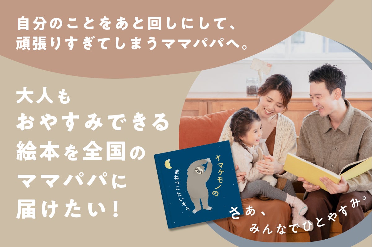 この度、本プロジェクトの一環として、読み聞かせを通じてママパパもリラックスできる絵本『ナマケモノのまねっこたいそう』を制作しました。「もっと、やすも!」と声を掛け合える社会を目指し、クラウドファンディングを実施します。