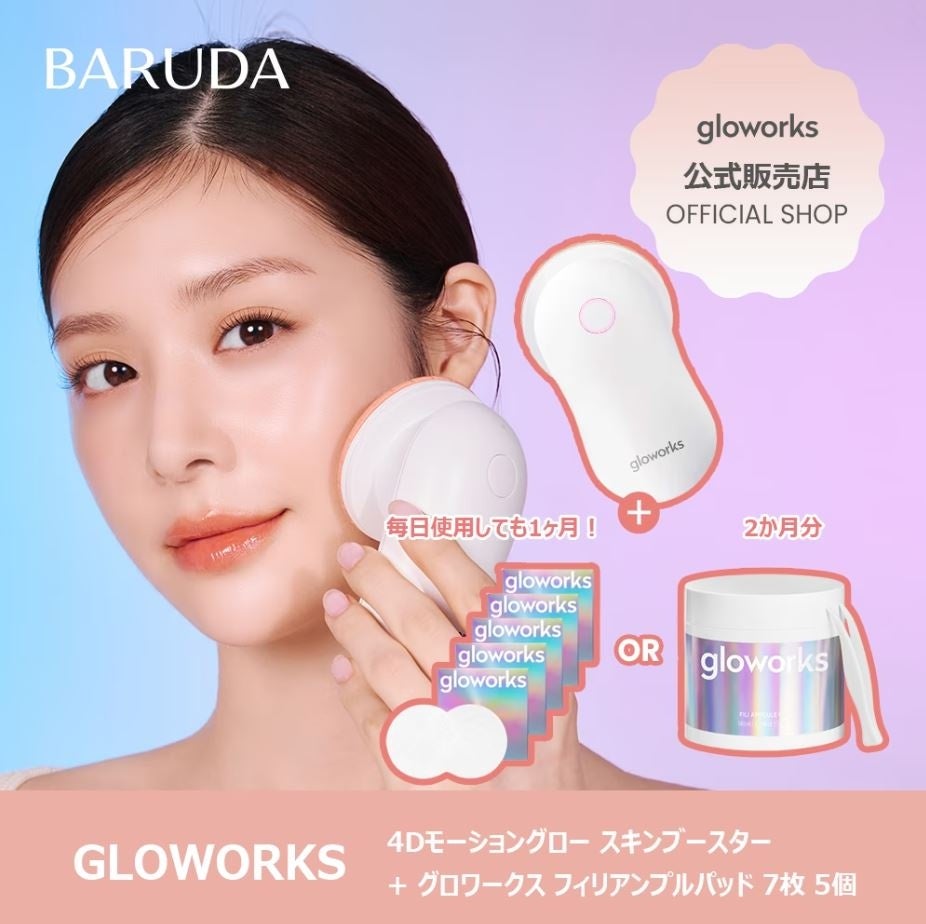 "GLOWORKS"は1日たった2分で輝く光彩肌が手に入ると話題の自宅でエステサロンのようなケアができる4Dモーションスキンブースターが人気のアイテムだ。ブースターに柔らかく繊細な紬糸で作られたパッドを組み合わせて、毛穴の奥深くまでクレンジングし、汚れ、油分、メイクの残余物を除去して滑らかでつややかな肌へ導く。一度使用すると必ずリピートしたくなる!