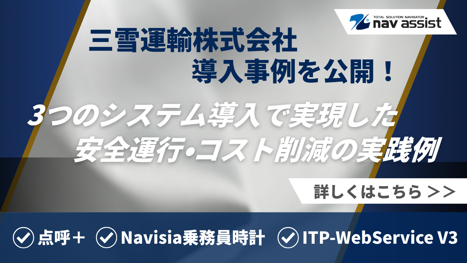 株式会社ナブアシスト(本社:群馬県前橋市、代表取締役:江口 大介、以下 ナブアシスト)は、三雪運輸株式会社(本社:愛知県名古屋市中川区、代表取締役:岡田 雅、以下 三雪運輸)が、『点呼+』『Navisia乗務員時計』『ITP-WebService V3』の3つのシステムを段階的に導入し、精密機器輸送という高度な輸送品質が要求される環境下で、業務効率化と働き方改革を同時に実現したことをお知らせします。