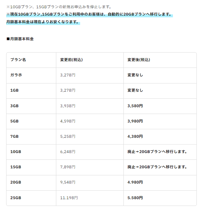※10GB、15GBをご利用中のお客様は自動的に20GBプランへ移行となります。