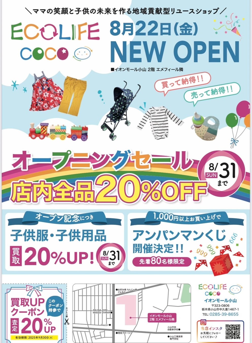 子供服リユースショップECOLIFE COCO(エコライフココ)「イオンモール小山店」を2025年8月22日(金)にオープンすることが決定いたしました。オープニング記念として店内全商品20%OFF、買取査定額20%UPを実施いたします。また、かわいいアンパンマンくじも開催。USヴィンテージキッズ古着も数量限定で販売予定です。お子様もママもおトクがいっぱいですのでぜひご来店ください。