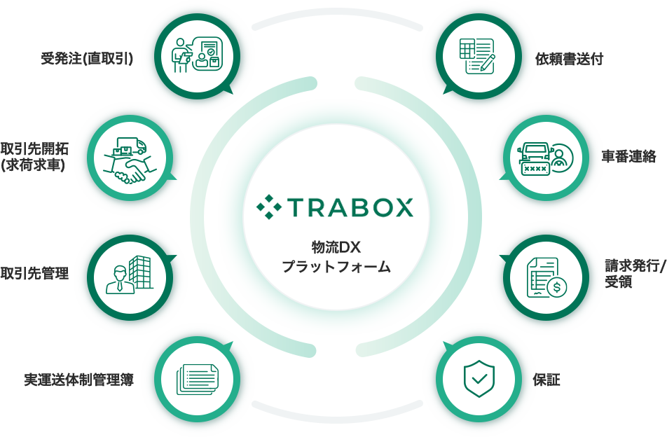 ■トラボックスでできること:本リリースにより、取引先管理から依頼書送付、車番返信、請求書発行まで一元管理が可能に