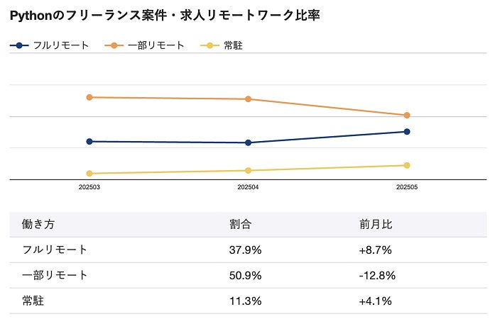 Python案件のフルリモート割合(37.9%)は前月比+8.7%と伸長しましたが、依然として一部リモートが過半数を占めています。