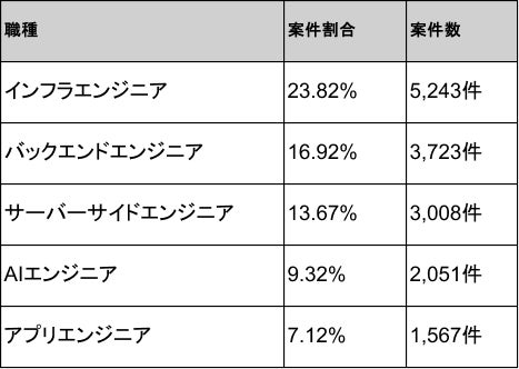 続いてAIエンジニアが9.32%(2,051件)、アプリエンジニアが7.12%(1,567件)で、生成AIやデータ分析を活用したサービス開発、モバイル向け機能実装の需要も確認できます。