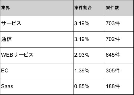 Python案件はサービス業界が最多3.19%(703件)、通信業界3.19%(702件)が僅差で続き、Webサービス2.93%(645件)が3位です。EC1.39%(305件)、SaaS0.85%(188件)を含む上位5業界で全体の約11.6%を占めます。