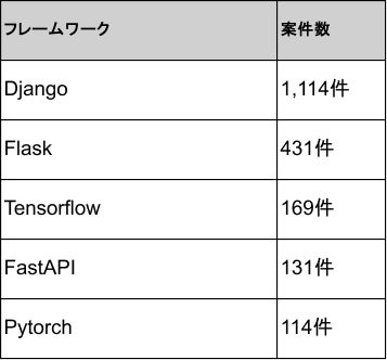 2位のFlaskは431件でDjangoに比べると規模は小さいものの、軽量APIやマイクロサービスで根強い需要があります。3位のTensorFlowは169件とライブラリ寄りのフレームワークながら、機械学習モデルの実運用を目指す企業から安定した引き合いがあります。上位3枠だけでPythonフレームワーク案件の大半を構成している点が特徴的です。