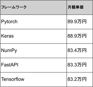 Python系フレームワークの月額単価ではPyTorchが89.9万円でトップ、次いでKeras88.9万円、NumPy83.4万円、FastAPI83.3万円、TensorFlow83.2万円となります。生成AIやLLM開発で専門性が求められるPyTorchは特に高単価です。