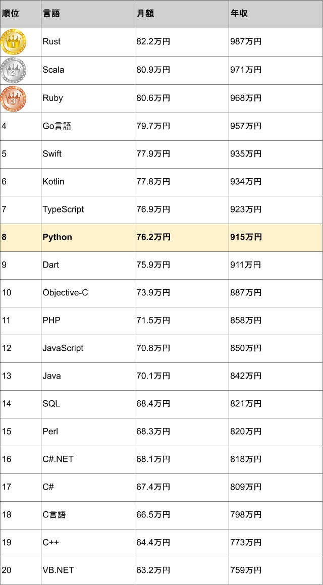 Python案件の平均月額単価は76.2万円、平均年収は915万円で、年収ランキングでは8位に位置しています。これはPythonが依然として堅調な市場価値を維持していることを示しています。