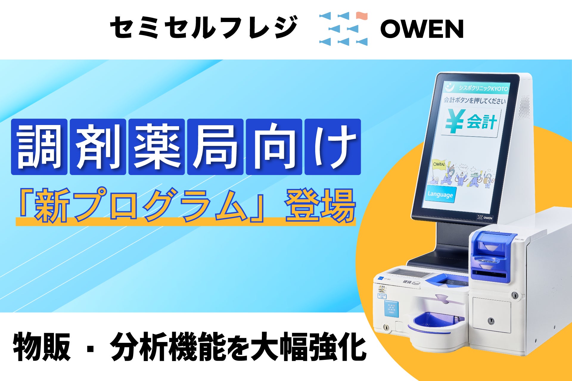 ORCA No.1(※)サポート事業所、および『OWEN』を運営する株式会社シスポ(京都府京都市、取締役・山中裕樹、梶谷正博、中井貴士)は、セミセルフレジ『OWEN』の新たなラインナップとして、調剤薬局向けに設計された「新プログラム」を追加し、2026年2月1日より提供を開始いたします。