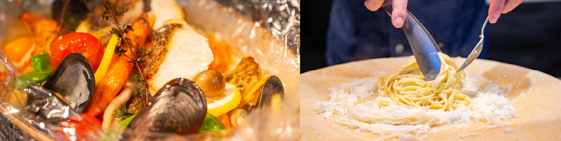 春キャベツやそら豆など、体に優しい春野菜をはじめ、桜鯛やあさり、しらすといった旬の魚介類を堪能できるメニューを取り揃えております。また、ハーブの香りと豚肉の旨みが絶妙な「ポルケッタ」(ポークロースト)や、ライブキッチンで直径約45cmのグラナパダーノチーズの上で仕上げる、目にも楽しい「グラナパダーノスパゲッティ」もおすすめです。