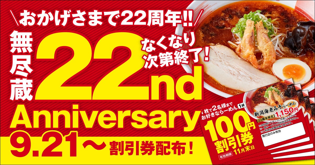 新潟県新潟市を本拠地とする株式会社キタカタ(本社:新潟県新潟市)は、運営する新潟発祥のらーめん店「無尽蔵」が2024年10月に22周年を迎えることを記念し、感謝の意を込めて「22周年Anniversary」を開催します。22周年Anniversaryの第1弾として、9月21日(土)から[k1] 、対象店舗をご利用いただいたお客様全員に、どのメニューにもお使いいただける100円割引券を配布します。各店、数に限りがあり無くなり次第、配付終了となりますのでお早めに手にお入れください。