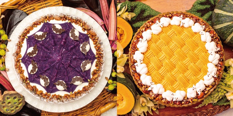 今年は2種類の限定タルトが登場いたします。1つ目は昨年大変ご好評いただいた人気の「長崎県五島列島産 紫芋とミルクチョコスフレのタルト」です。秋の味覚である紫芋をふんだんに使った鮮やかなパープルカラーにコウモリのチョコを飾った一品です。2つ目は、濃厚なかぼちゃのプリンとたっぷりのかぼちゃクリームを使用し、クリームで作ったユニークなオバケが目を引く「オバケクリームとパンプキンのタルト」です。