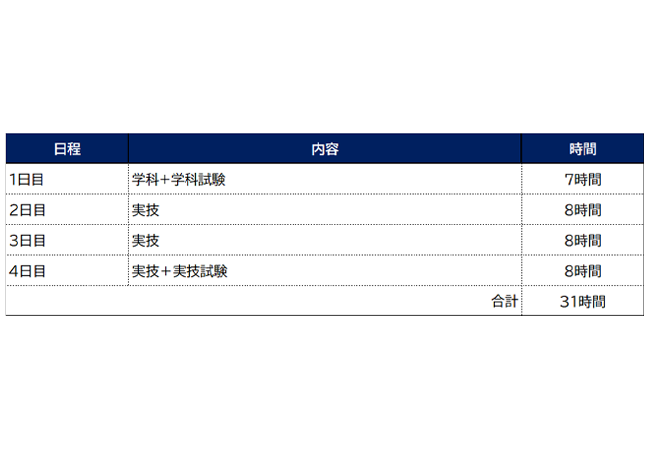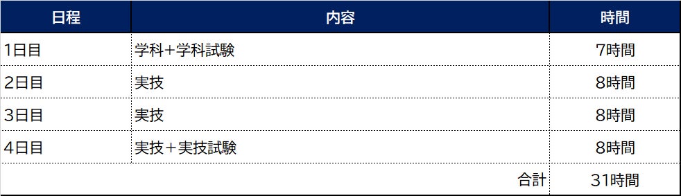 受講日数は4日となります(下記に試験時間・休憩時間は含まれておりません)。