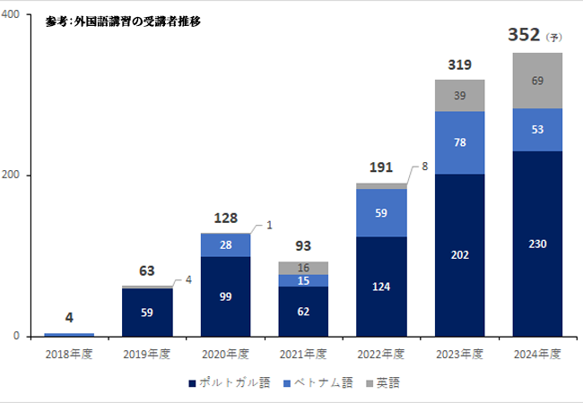 群馬県太田市は、関東有数の工業団地を抱え、多くの製造業や建設業が集結しています。また、同業界では慢性的な人手不足が続いており、外国人労働者の受け入れが増加傾向にあります。そのような背景もあり、2018年の開所当初より外国語講習のリクエストが非常に多く、要望に応える形で、2019年2月からポルトガル語のコースを開始しました。外国語講習受講者数も昨年度は過去最高の319人を記録し、今後も増加する見通しとなっております。