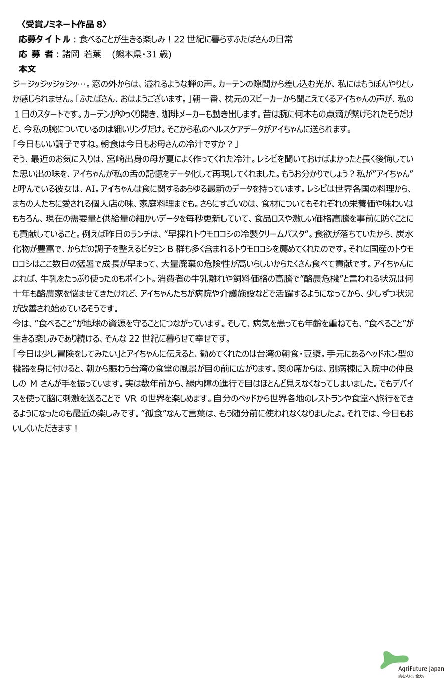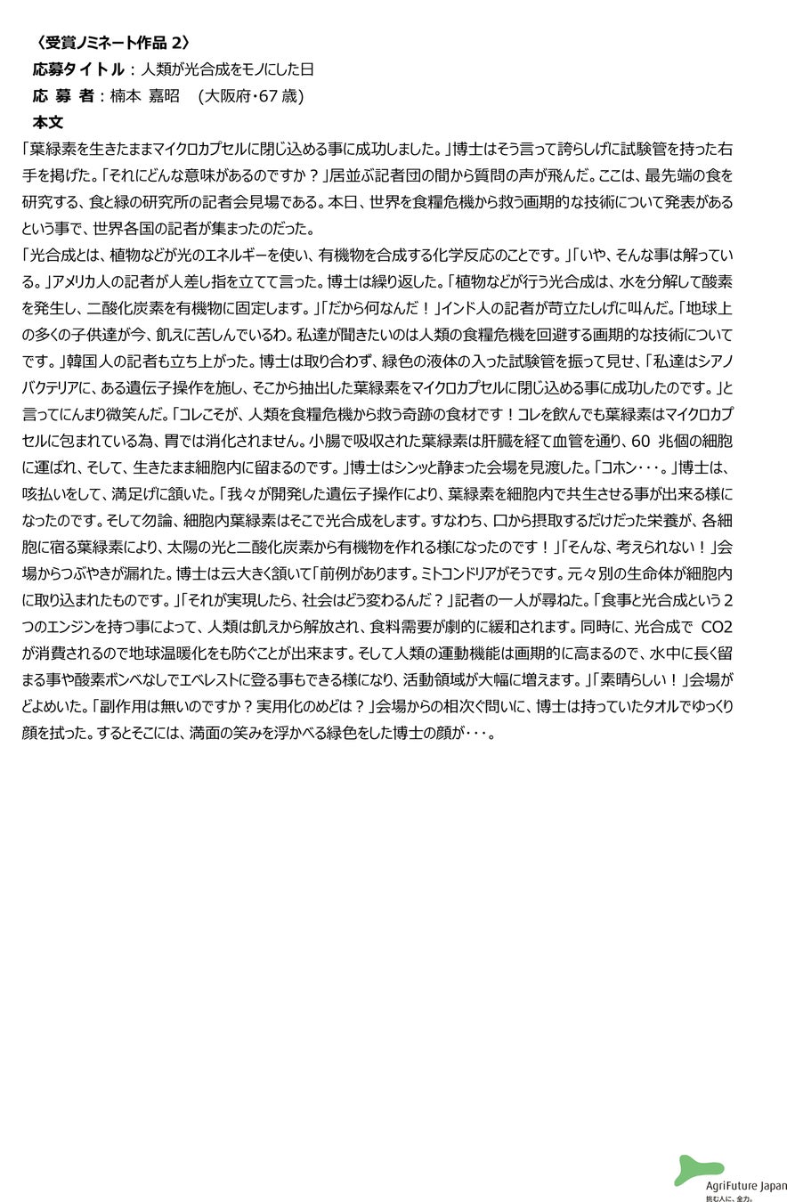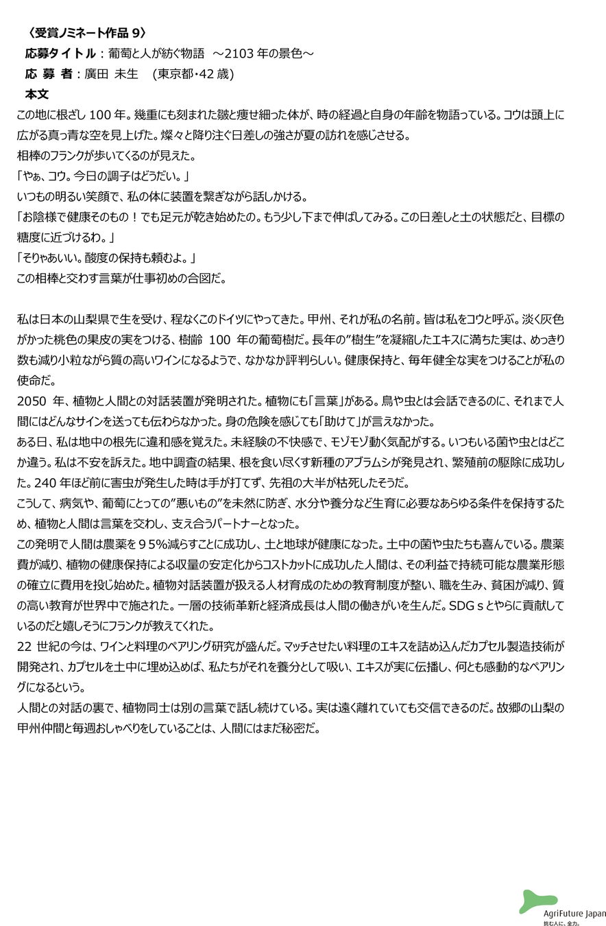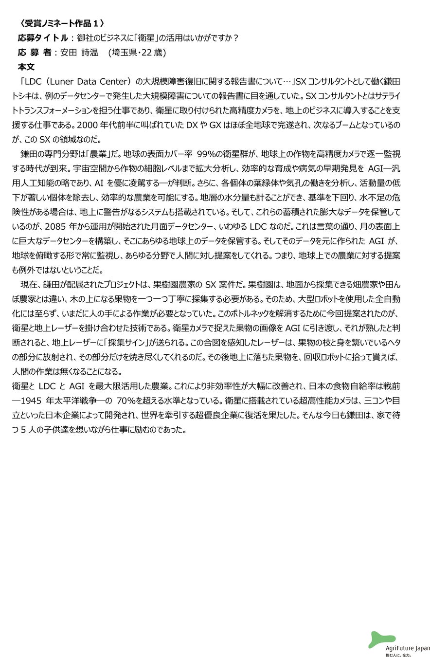 一般社団法人アグリフューチャージャパン(理事長:合瀬宏毅、東京都港区)が開催する第二回『未来エッセイ2101』 (以下、本コンテスト)の受賞ノミネート作品を選出いたしました。