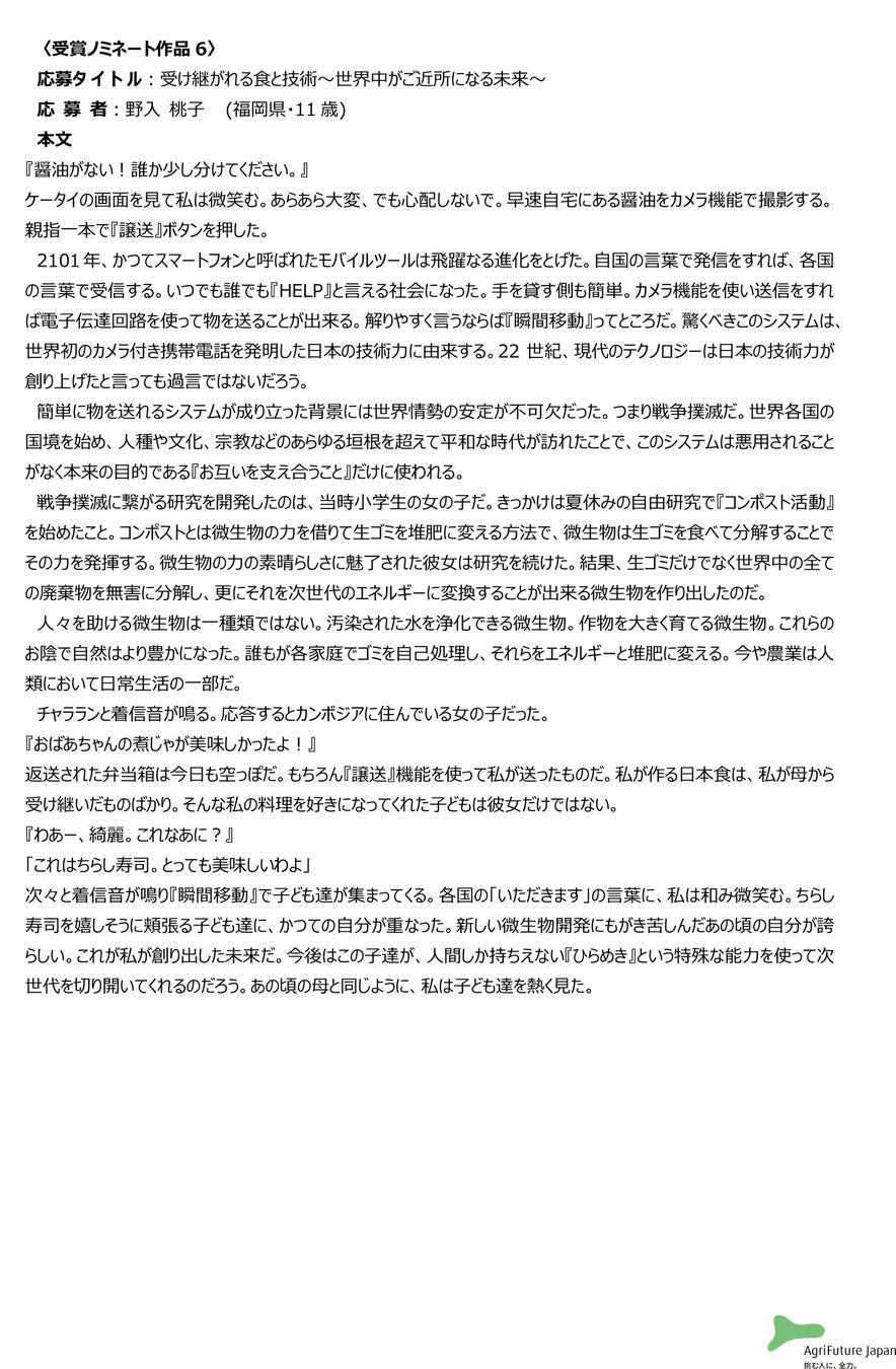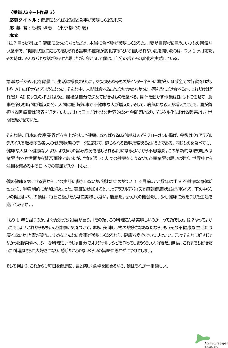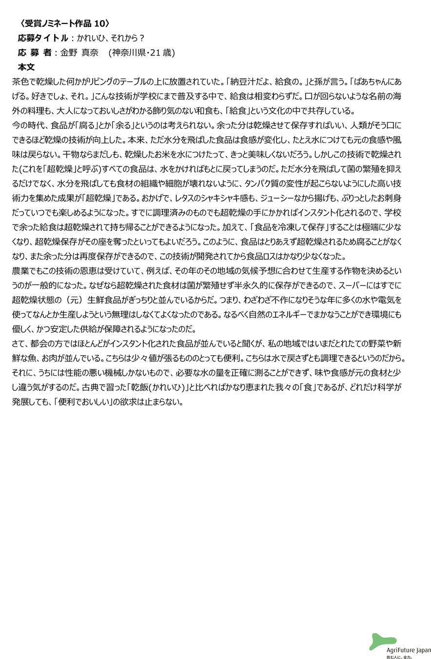 一般社団法人アグリフューチャージャパン(理事長:合瀬宏毅、東京都港区)が開催する第二回『未来エッセイ2101』 (以下、本コンテスト)の受賞ノミネート作品を選出いたしました。