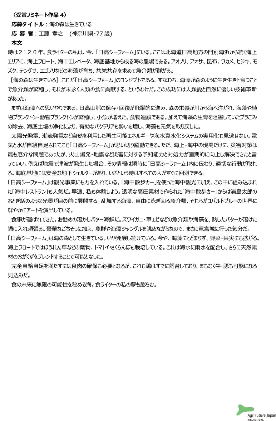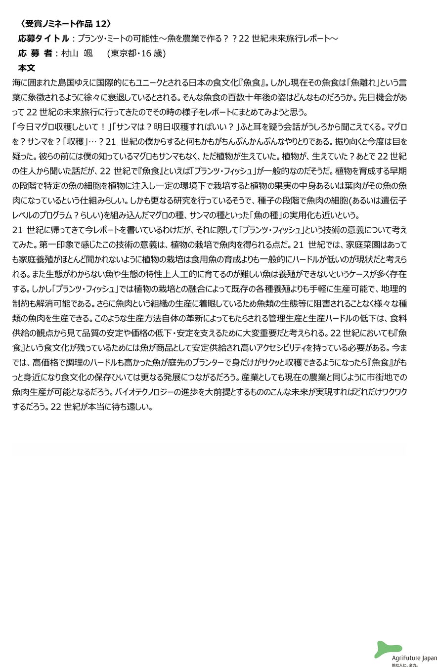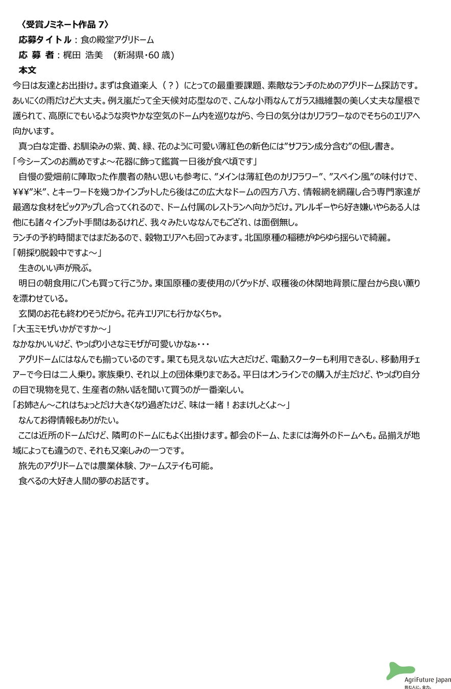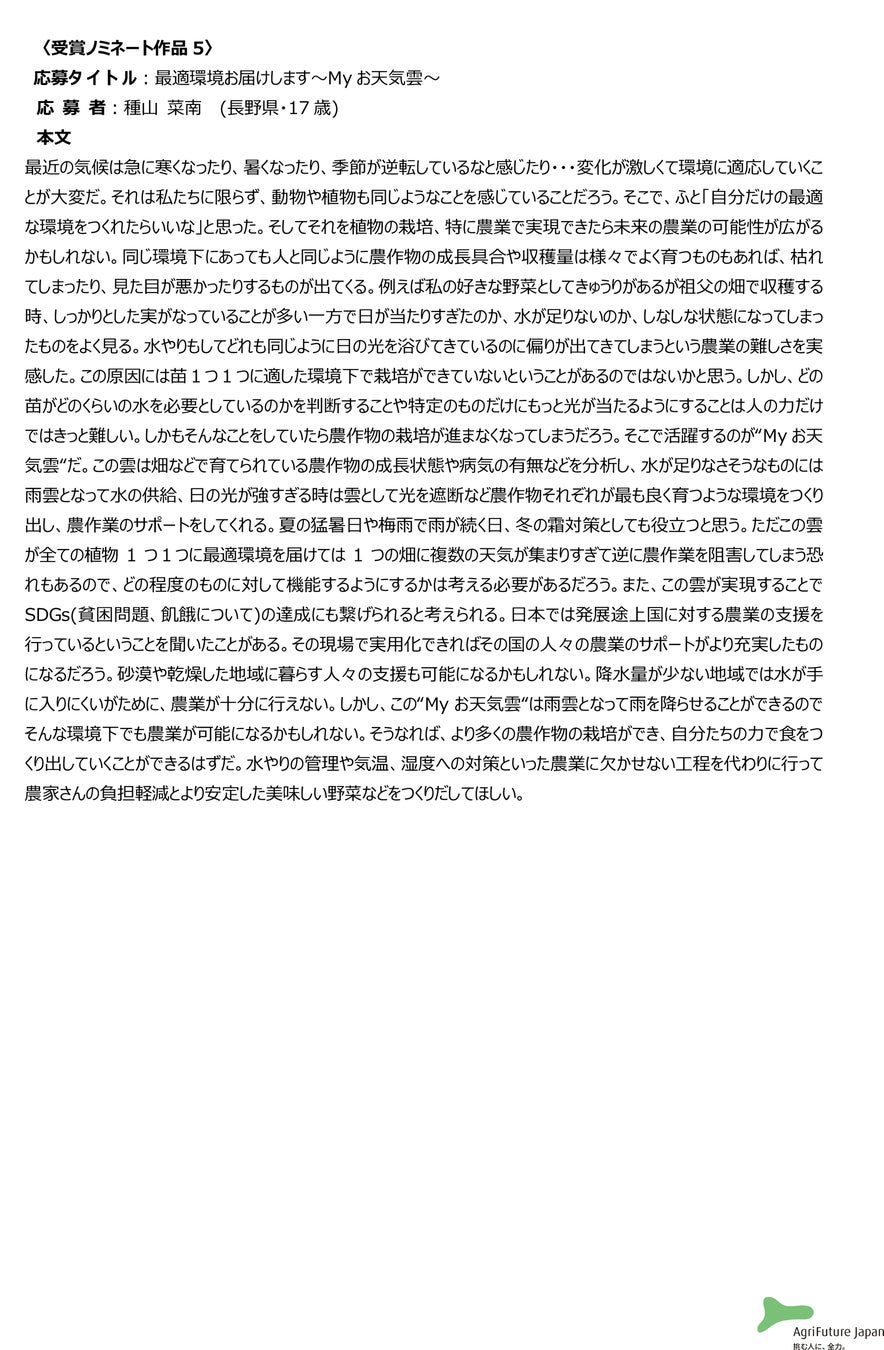 一般社団法人アグリフューチャージャパン(理事長:合瀬宏毅、東京都港区)が開催する第二回『未来エッセイ2101』 (以下、本コンテスト)の受賞ノミネート作品を選出いたしました。