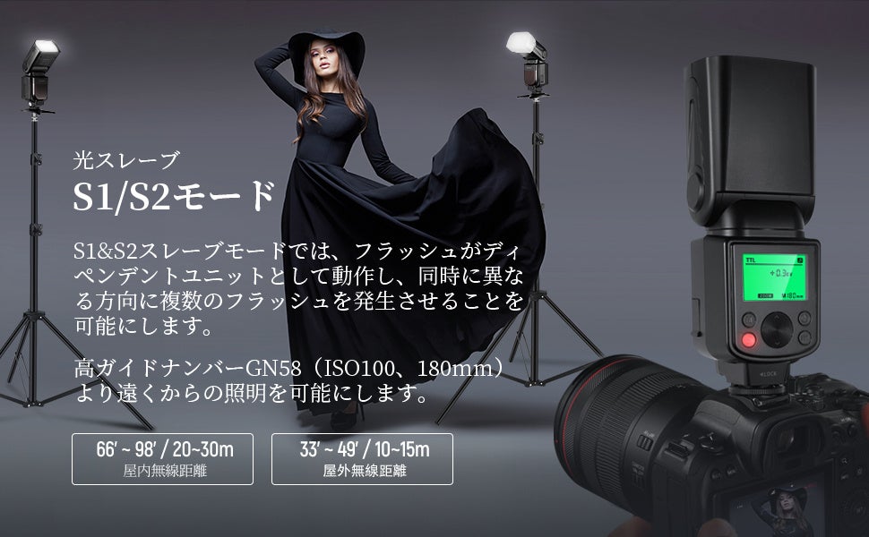 ■【TTL、マニュアルモード、光学スレーブS1/S2モード、フラッシュ露出補正など機能サポート】