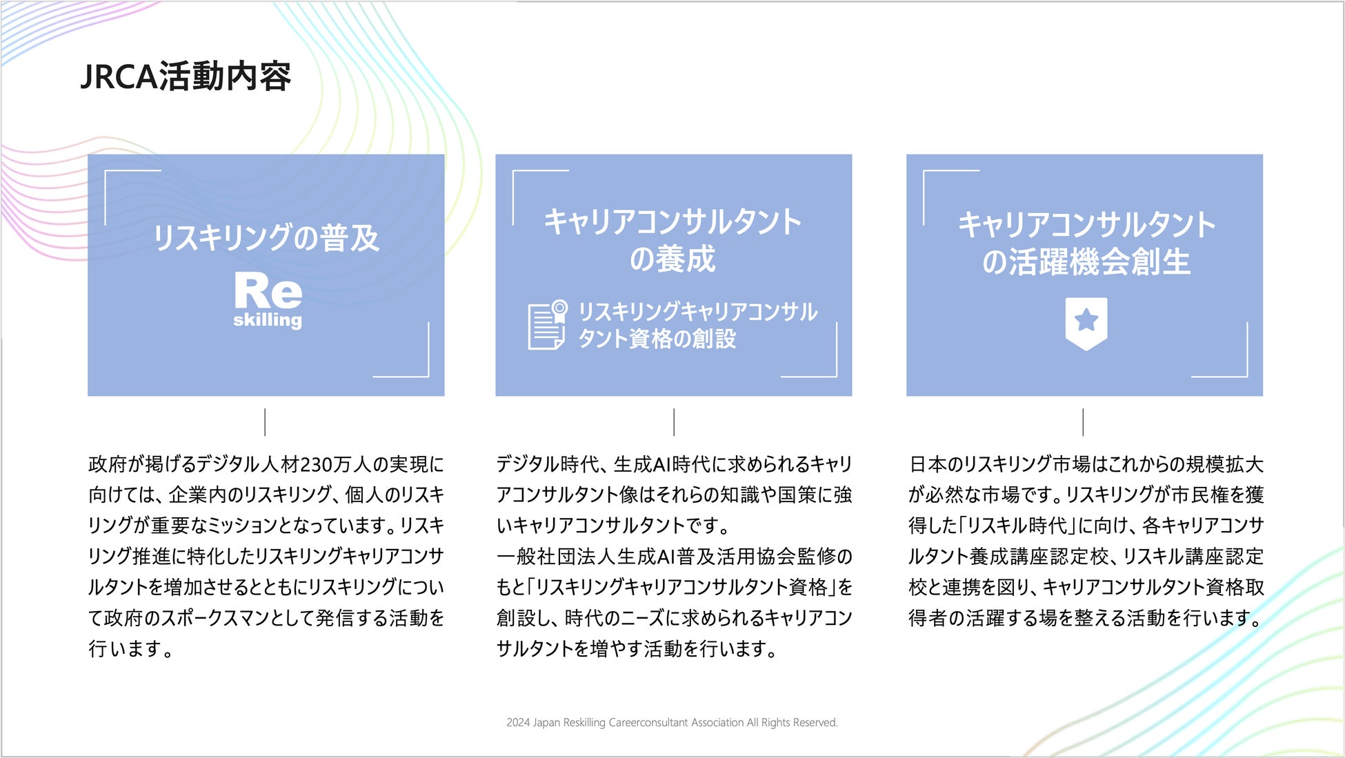 JRCAは、生成AI時代のリスキリング(学び直し)に適応したキャリアコンサルタントの輩出を推進する一般社団法人です。「リスキリングの普及」「キャリアコンサルタントの養成」「キャリアコンサルタントの活躍機会創生」の3つを軸とした活動を行います。キャリアコンサルタント自身のリスキリングを支援し、活躍機会の創生に取り組むことで、キャリアコンサルタント一人ひとりがより輝ける未来の構築を目指します。