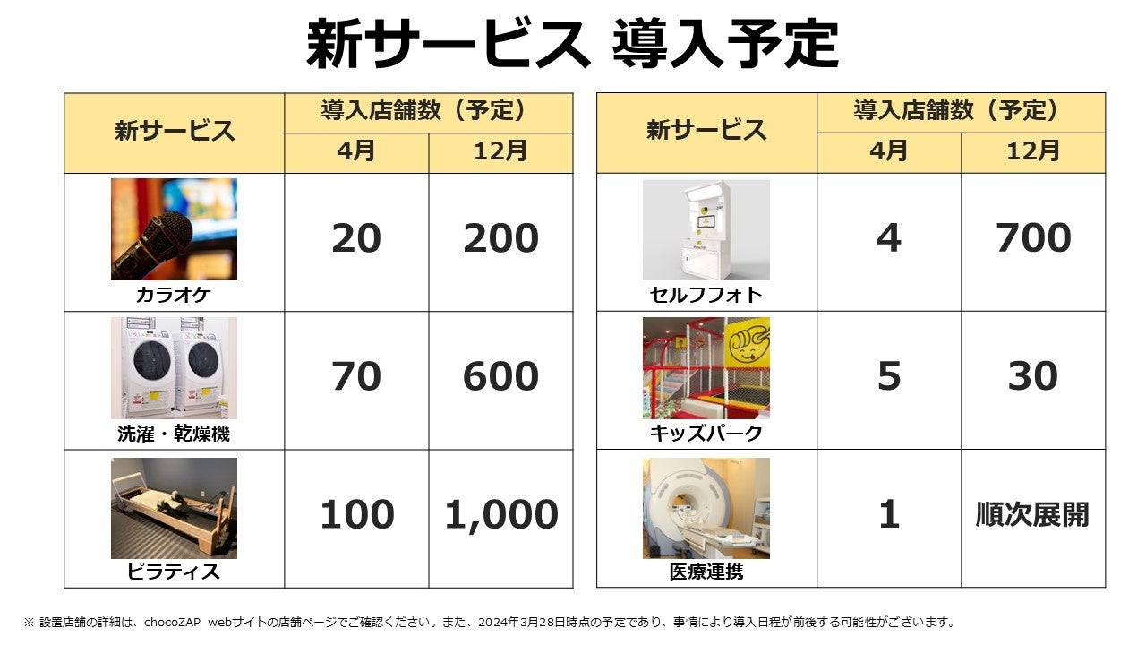 RIZAPグループ株式会社(代表取締役社長 瀬戸 健、本社:東京都新宿区、以下「RIZAPグループ」)の連結子会社であるRIZAP 株式会社が運営するコンビニジム「chocoZAP(チョコザップ)」は、2024年3月28日より、お客様のさまざまなご要望にお応えするために、「カラオケ」や「洗濯・乾燥機(ランドリー)」「ピラティス」「chocoZAPメディカル」など、計7種の新サービスの本格導入を決定いたしましたのでお知らせいたします。