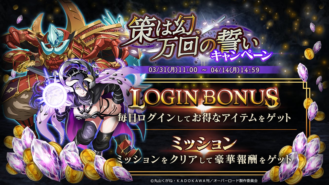 3/31よりイベント『策は幻、万回の誓い』を実施!召喚では『★5【大錬金術師の愛娘】アルベド』、『★5【ザ・サムライの愛息子】コキュートス』が登場します!
