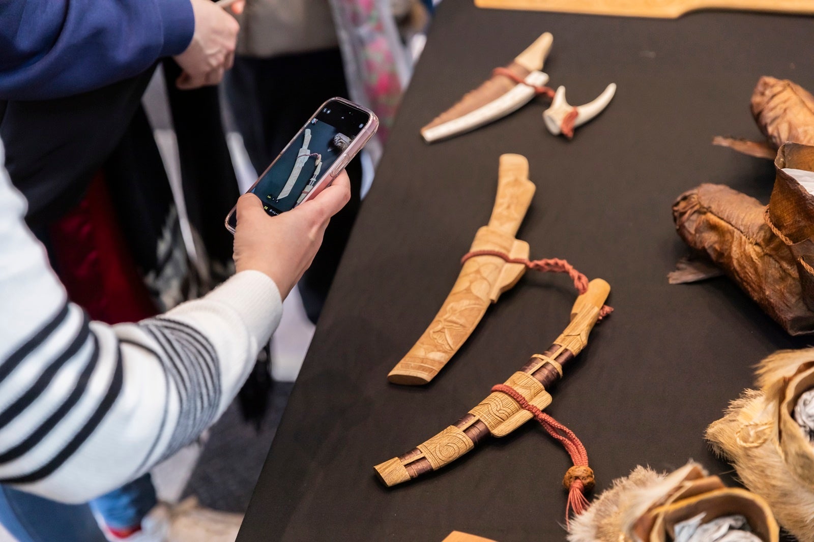 衣服や儀礼の道具などを展示します。実際に見て、触れることで、アイヌ文様や木彫りの造形の奥深さ、魅力を伝えます。