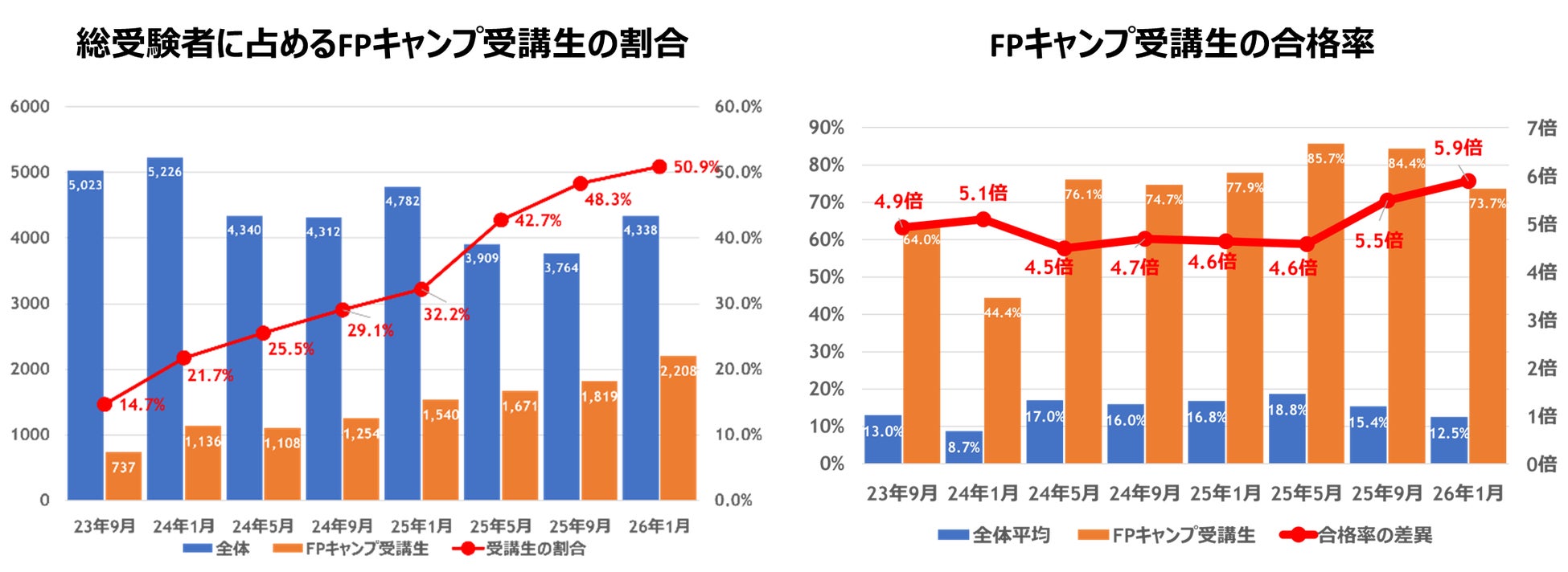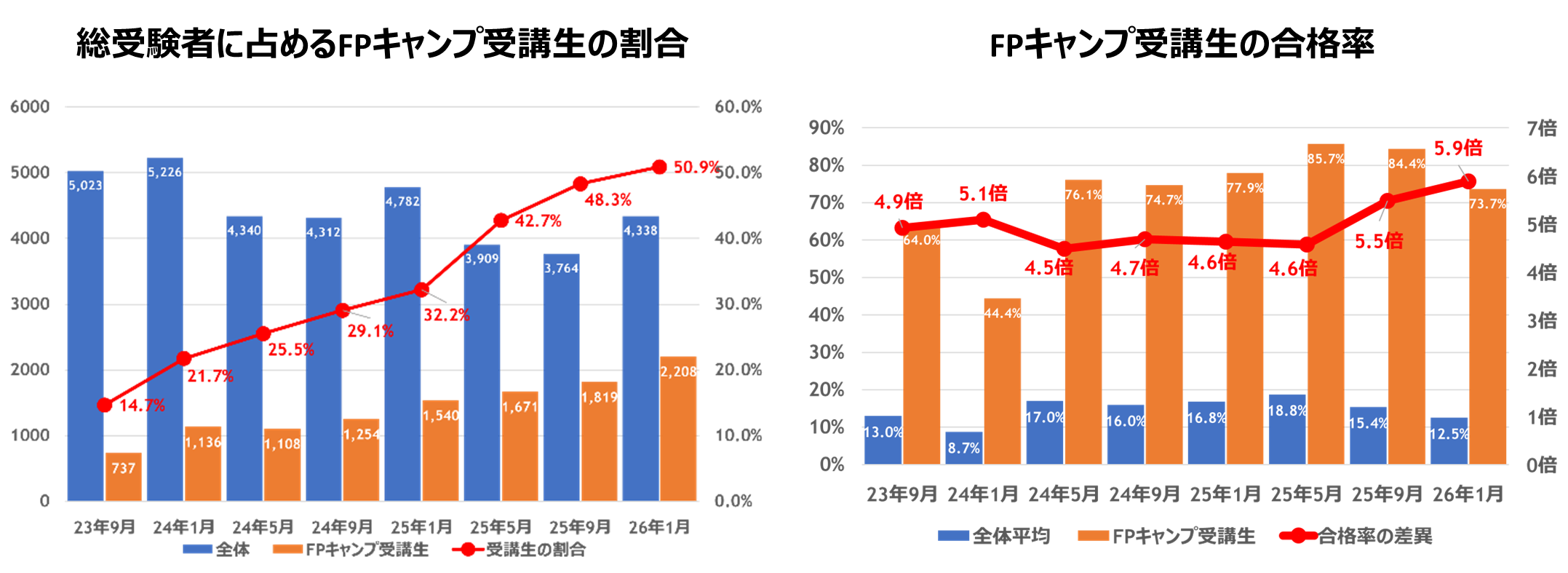 2026年1月のFP1級学科試験において、総受検者4,338名のうちFPキャンプ受講生が占める割合は50.9%※1となり、初めて全体の5割を上回りました。FPキャンプが開講した2023年7月以降、受検者に占める受講生の割合は8回連続で右肩上がりの成長を続けています。また、今回のFPキャンプ受講生の合格率は73.7%※2と、全体の合格率12.5%の約5.9倍を記録。2023年7月以降の試験において、8回連続で全体合格率の4.5倍を超える高い合格率を達成しています。