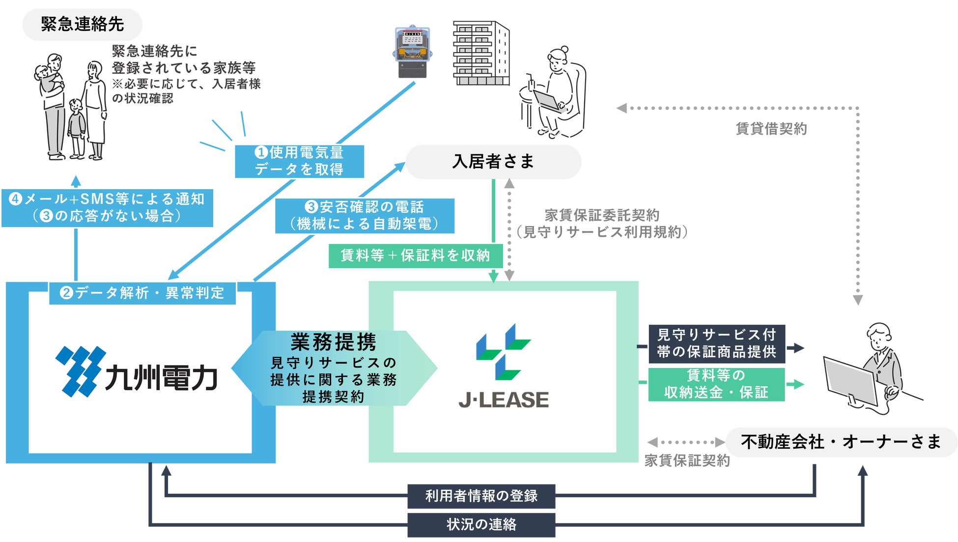 ジェイリース株式会社(本社:東京都新宿区・大分県大分市、東証プライム市場:7187、以下ジェイリース)は、九州電力株式会社(本社:福岡県福岡市、以下九州電力)と業務提携し、九州電力が提供する使用電力量データを活用した入居者見守りサービス「Q-ieまもり」の仕組みに付帯する保証サービス「Q-ieまもり for ジェイリース」の提供を開始しましたことをお知らせいたします。