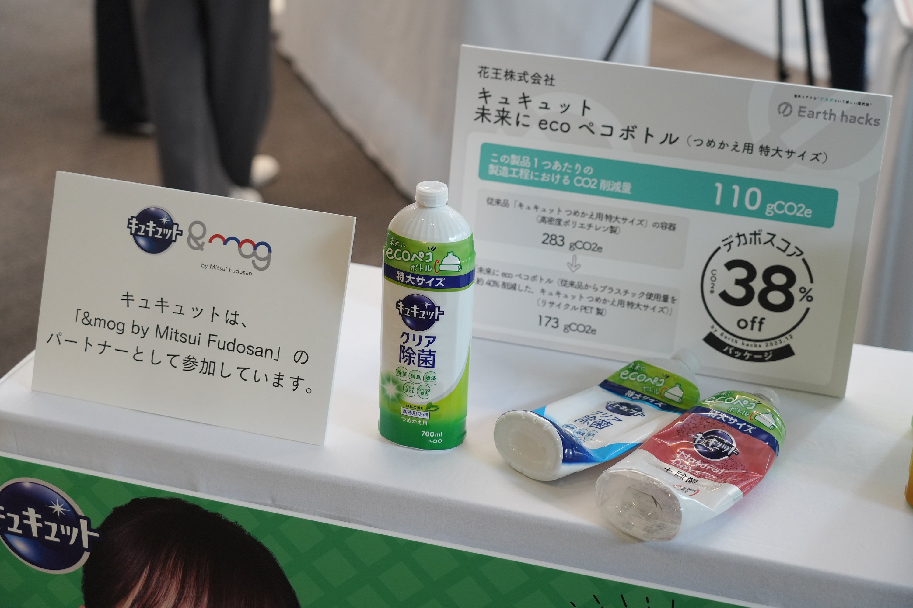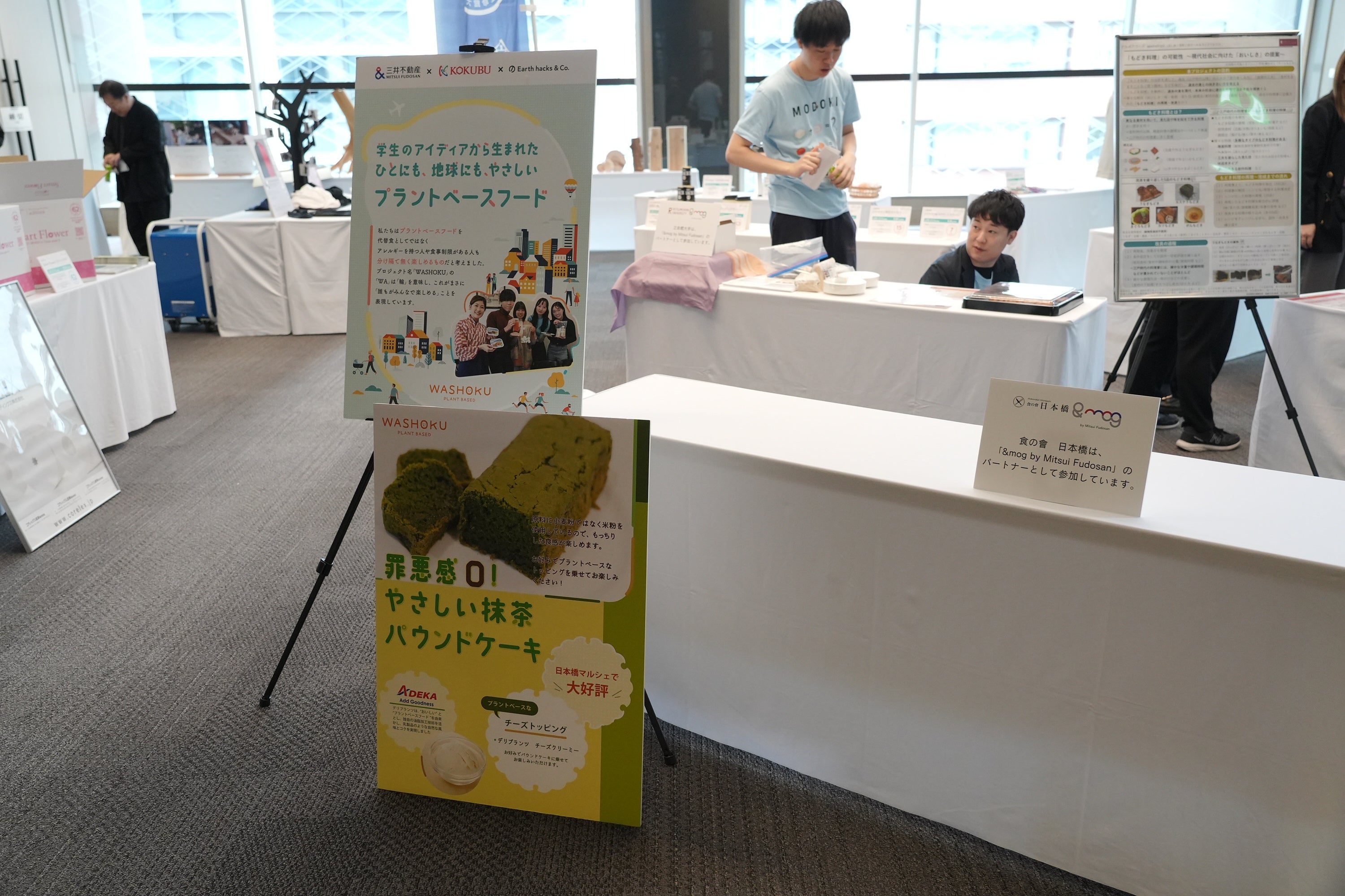 アワード会場ではノミネート企業をはじめとして、Earth hacksのパートナー企業によるデカボアクションを紹介する展示イベントも同時開催いたしました。また、Earth hacksがパートナー企業として参画している三井不動産株式会社の「&mog by Mitsui Fudosan」の特別展示も実施し、同じくパートナー企業の花王株式会社の食器用洗剤「キュキュット」の「未来にecoペコボトル」の実物展示、立命館大学食マネジメント学部が製作した「もどき料理」やビジネスコンテストプログラム「Earth hacks デカボチャレンジ 2023」に参加した学生と国分グループ本社株式会社、三井不動産株式会社が共同開発したプラントベースドフード「罪悪感0!やさしい抹茶パウンドケーキ」の試食提供など、参画企業の取り組みをご紹介させていただきました。