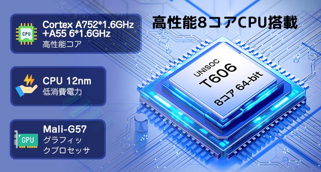 プロセッサはUNISOC T606 RAM:12GB(6GB+6GB拡張) ROM:128GBで 実機でのAnTuTuベンチマークスコアは27万以上です。WEBブラウジングやYouTubeの動画視聴など、普段使いで困ることもなくちょっとしたゲームにも適合で更に、12nmプロセステクノロジーを採用しており、発熱を抑えながら、低消費電力を実現します。