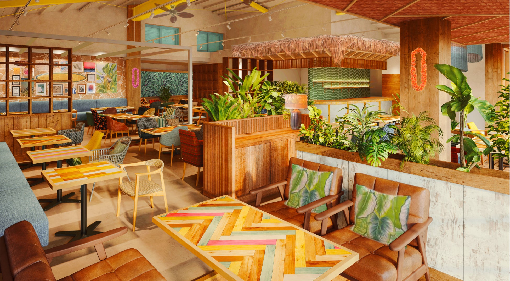 カラフルなハワイアン雑貨やサーフボードが飾られ、遊び心のあるソファやテーブルなどのこだわりのインテリアが、まるで、ハワイのローカルのリビングにいるような雰囲気を演出します。ゆったりとくつろげる空間で、日本にいながらハワイ気分を味わえます。