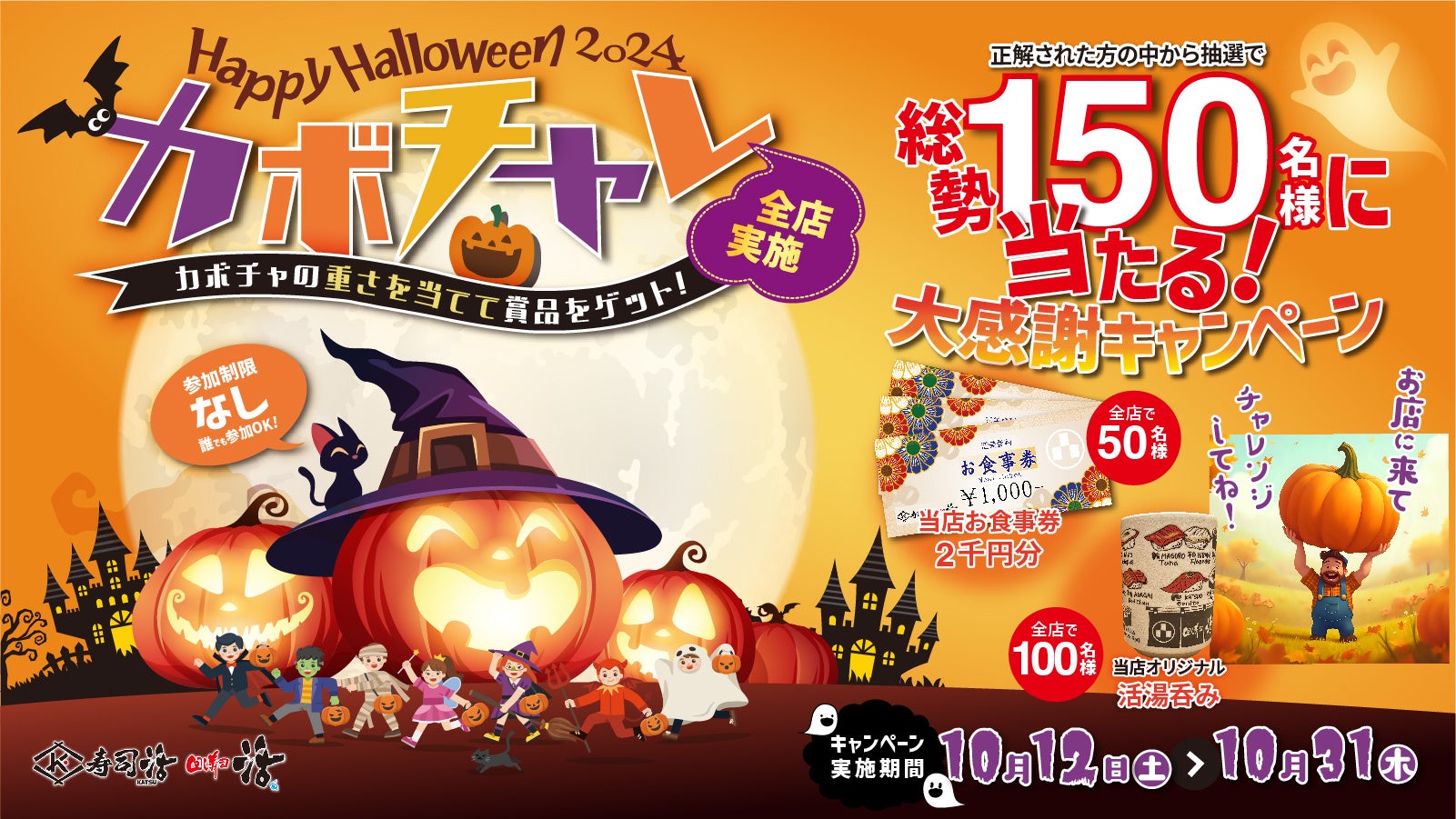 株式会社活美登利(本社:東京都品川区、代表取締役社長:土屋秀仁)が運営する「回し寿司活/寿司活」は、運営店舗全店で10月31日(木)まで期間限定のイベント「カボチャレ2024」を実施しております。