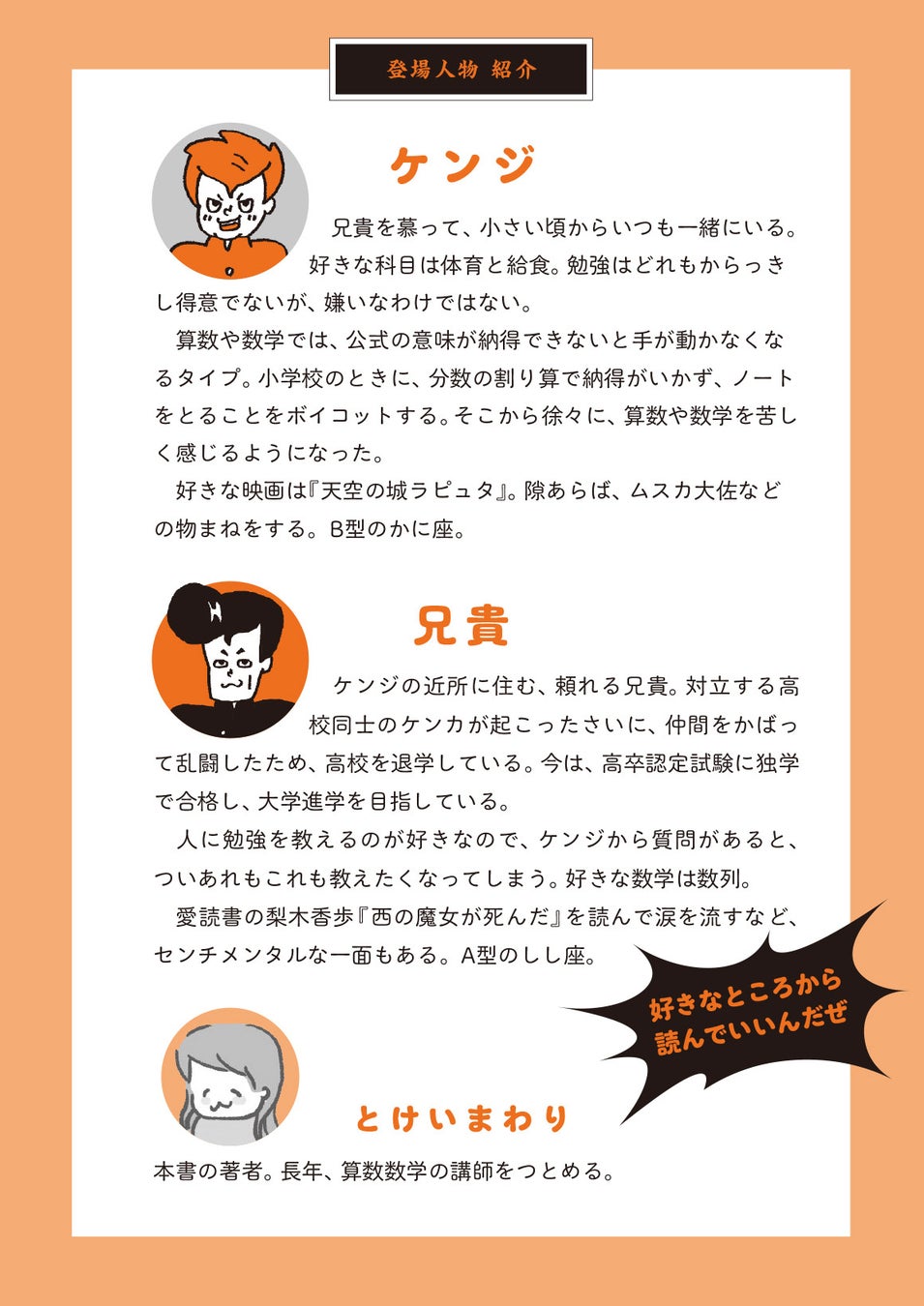 何のために学び、どこにつながるのか……知っていたら、もっと頑張れたはずだった。「そういうものだから」と言い聞かせられてきた、絶妙に納得できないテーマを厳選。算数・数学に不満たらたらのケンジと、数学好きの兄貴が、対話しながらひも解いていく。