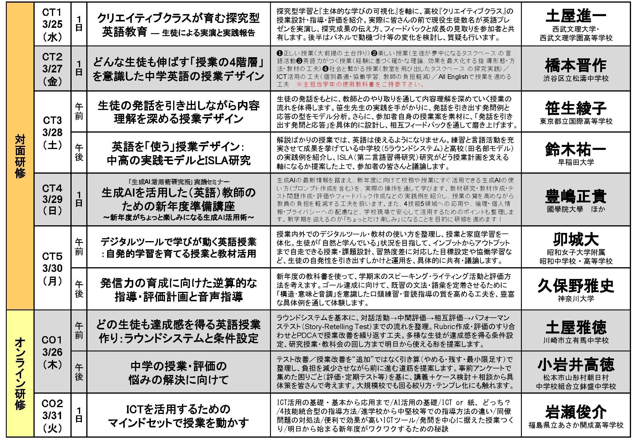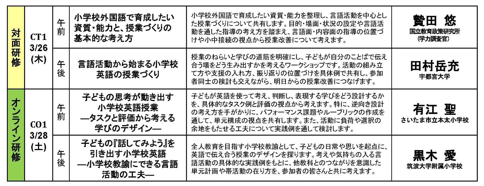 一般財団法人英語教育協議会 (東京都千代田区、理事長:赤阪清隆、以下「ELEC」)は、春休み期間中、英語教育に携わる先生方・教育関係者の皆様に向けて、日々の授業にすぐ生かせる実践中心の研修会を実施いたします。1日完結の研修会で、新たな指導の視点や具体的な工夫をともに学び、これからの授業づくりを見つめ直してみませんか。