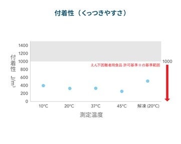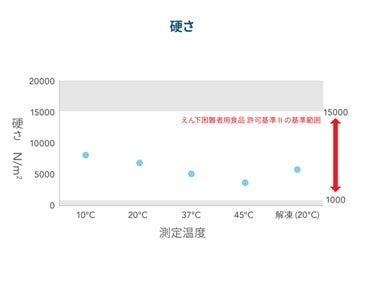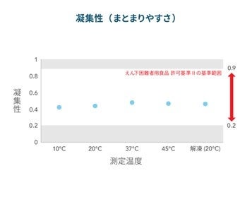 特別用途食品「えん下困難者用食品」※2の規格基準および測定方法に基づき、ゼリーの硬さ、付着性(くっつきやすさ)、凝集性(まとまりやすさ)の評価を行いました。その結果、10℃、20℃、37℃、45℃、および冷凍解凍後の20℃の温度条件において、いずれもえん下困難者用食品の許可基準Ⅱ(日本摂食嚥下リハビリテーション学会嚥下調整食分類 2021では嚥下調整食1jに相当※3)を満たしました。