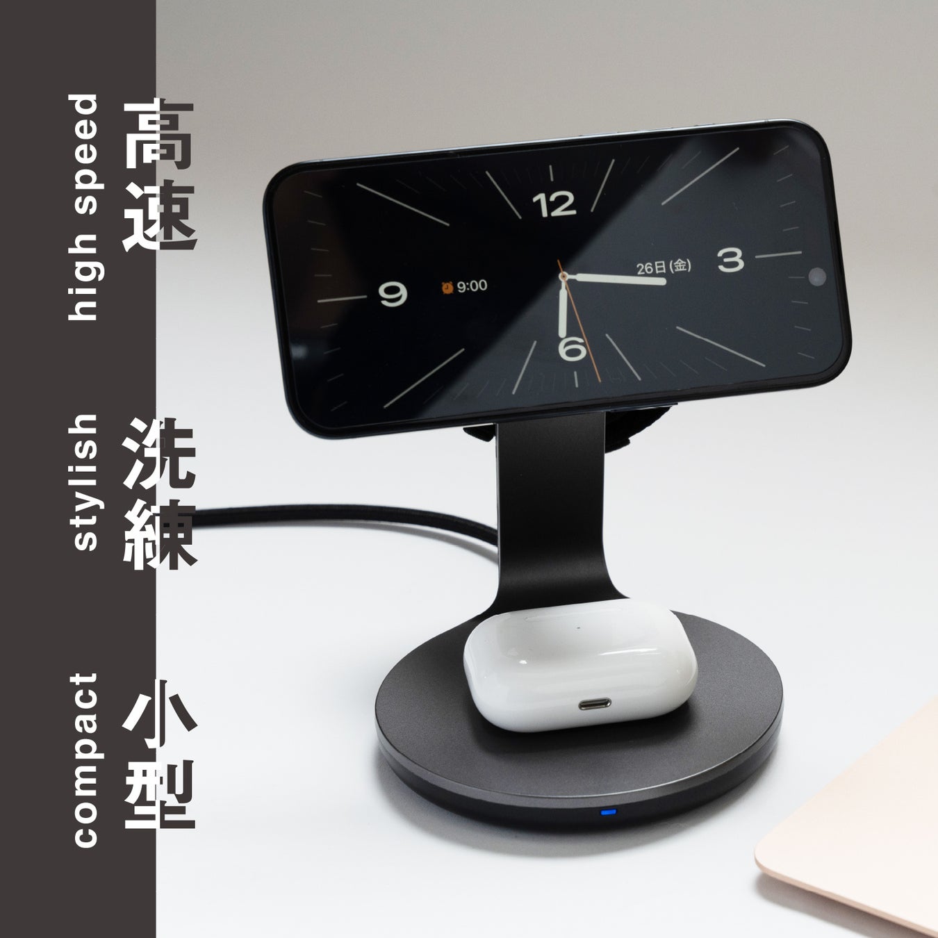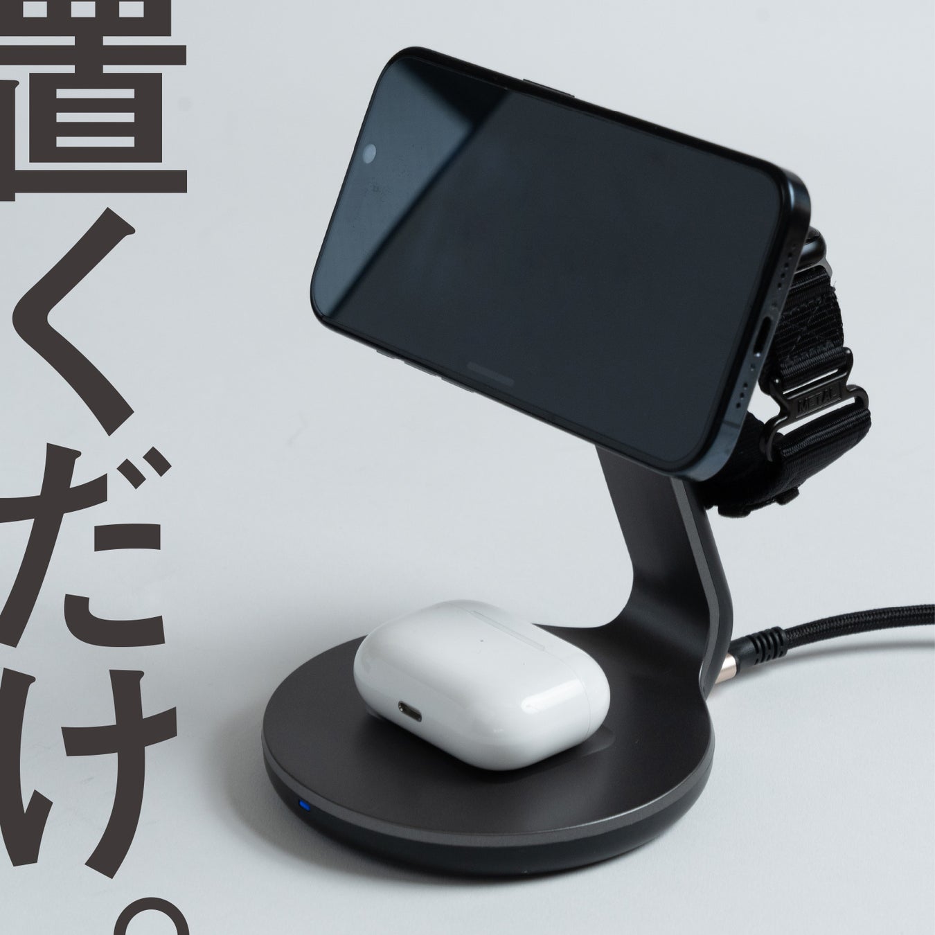 無駄の無いシルエットが、あなたのデスク周りを変える。最大15ワットの最適な出力で、スマホとウォッチ&イヤフォンをまとめて高速充電。最適な出力のACアダプターもセットになって特別価格での新登場!