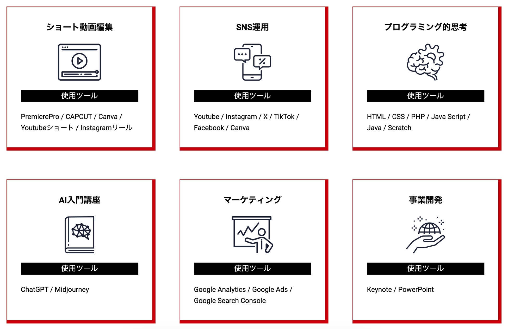 REDEEリスキリング講座は助成金を活用させより深く学ぶ「REDEE10時間リスキリング」、明日から使え、最短最速で学ぶ「REDEE1DAYリスキリング」の2つの受講プランがあり、どちらのプランでも下記6つの講座の中から選択が可能です。
