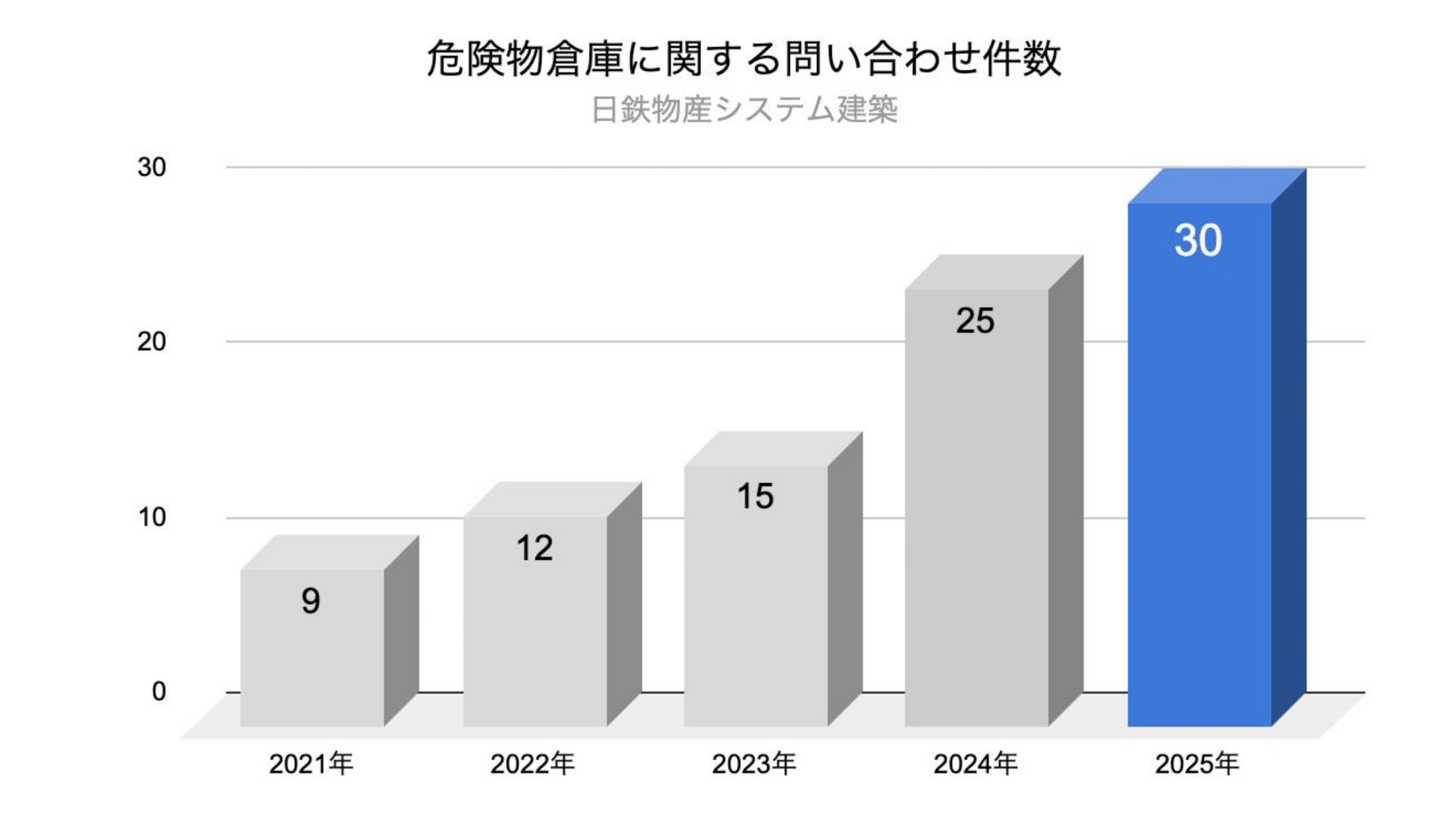 システム建築の専業メーカーである日鉄物産システム建築株式会社(本社:東京都港区、代表取締役社長:宇野 智)は、危険物倉庫の施工需要が高まるなか、過去5年間で20件・39棟の危険物倉庫を施工した実績を公開しました。また、危険物倉庫に関する問い合わせ件数は2021年の9件から2025年には30件と約3.3倍に増加し、施工実績も同期間で3件から14件へと約4.6倍に拡大しています。