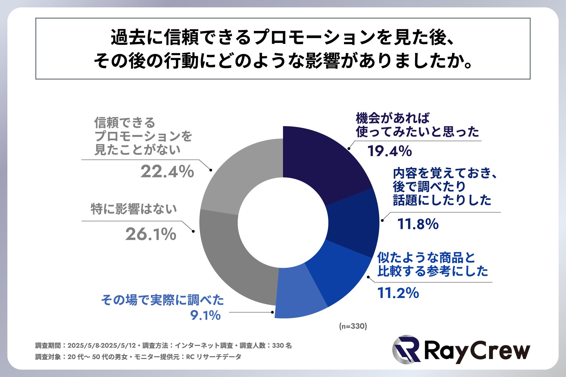 調査の最後、「過去に信頼できるプロモーションを見た後、行動にどのような影響があったか」を尋ねる設問への回答では、1位が「特に影響はない」で26.1%、2位が「信頼できるプロモーションを見たことがない」で22.4%、3位が「機会があれば使ってみたいと思った」で19.4%という結果になりました。この結果から、信頼できるプロモーションを見た後の行動で最も多いのは、「機会があれば使ってみたいと思うこと」であることがわかりました。