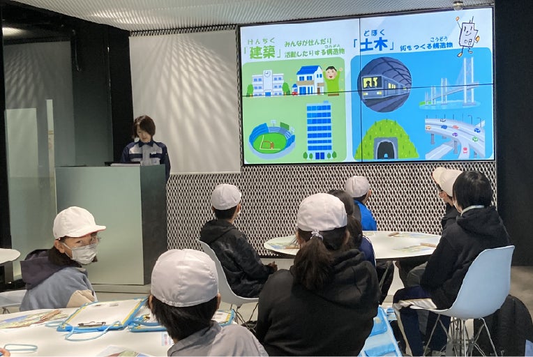 建設業の社会的使命や、身近にある"土木"や"建築"について紹介するとともに、生産性向上や業務効率化を目指した技術開発に取り組んでいることなどを説明しました。