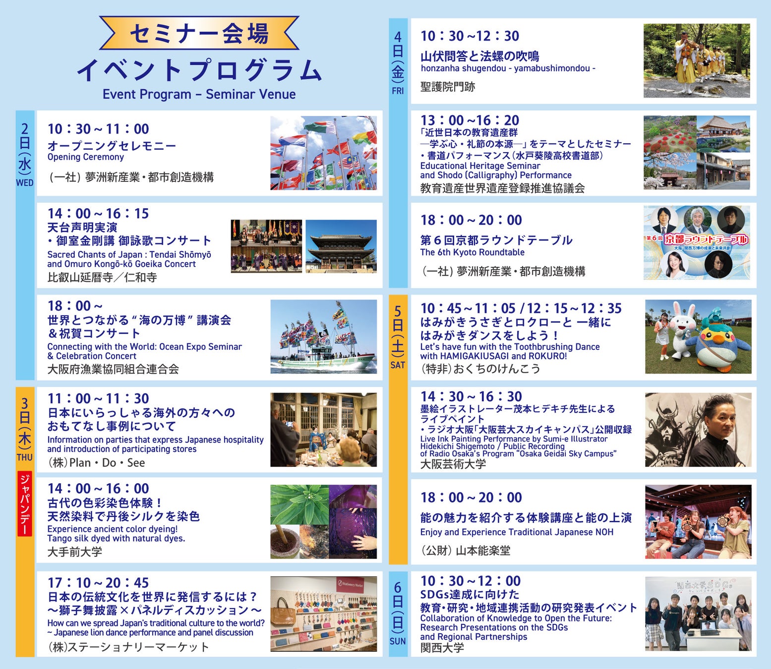 さらに、同会場内セミナー会場において、「第3回日本国際芸術祭/大阪・関西万博展」を盛り上げる様々なイベントを開催いたします。