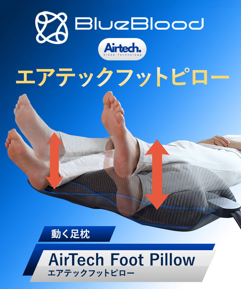 動く寝具、エアテックシリーズの「動く足枕」。ゆったりとしたリズムで足を上げ下げしリラックスした状態でそのまま眠りにつくことができるので、新しい入眠儀式としておすすめです。