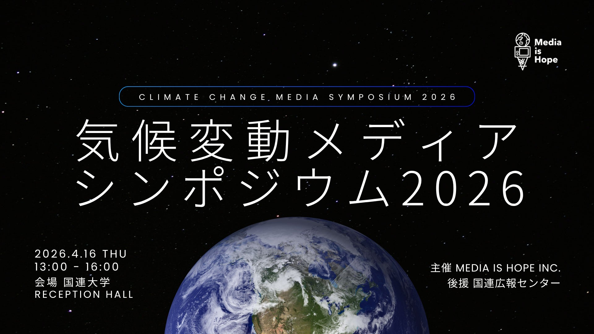 2026年4月16日(木)に一般社団法人Media is Hope主催の「気候変動メディアシンポジウム2026」を国連大学にて開催いたします。メディア関係者を中心に、オーディエンスや企業、専門家ら多様な主体とともに、気候変動報道の先進事例を共有し、「気候変動報道を継続する仕組みづくり」に向けたディスカッションを繰り広げます。