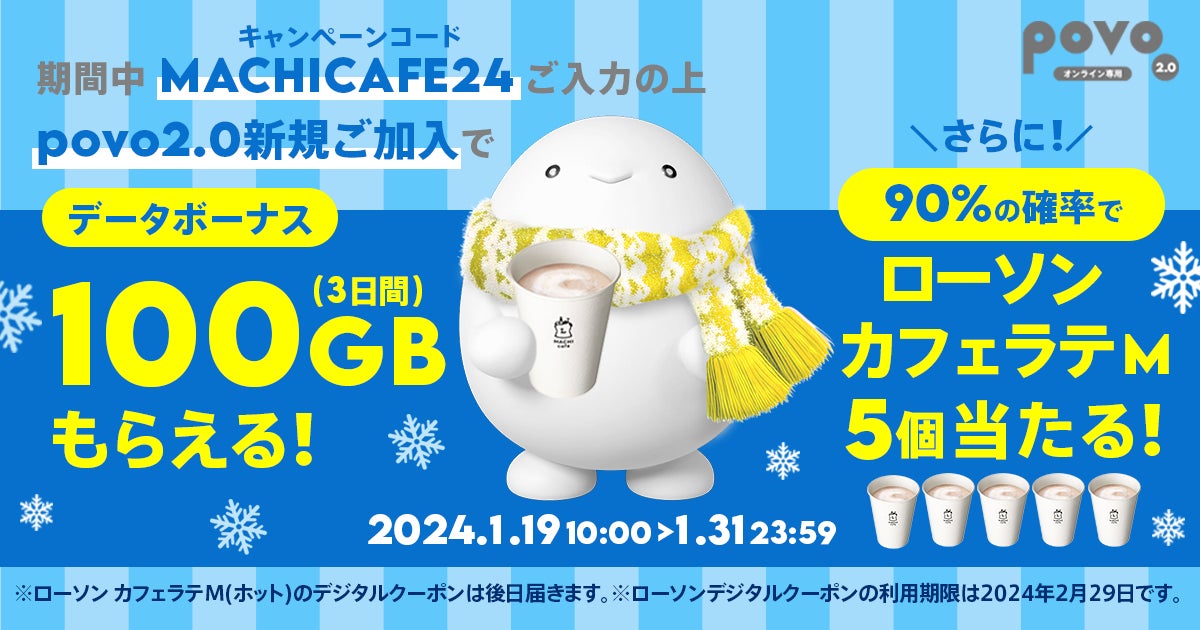 また、1月31日までのpovo2.0新規加入で、100GB(3日間)を必ずもらえるほか、抽選で90%の確率(注)で「マチカフェ カフェラテM」5杯分があたるキャンペーンを開催します。