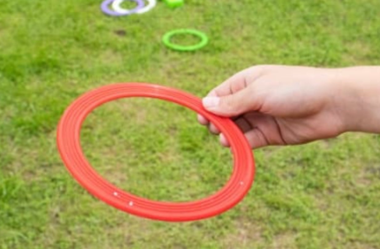 キャンプの時の必須アイテム「ペグ」に向かって、輪投げに挑戦!子どもを片手で抱っこした状態で、ママ・パパは何個輪投げをいれられるか?!