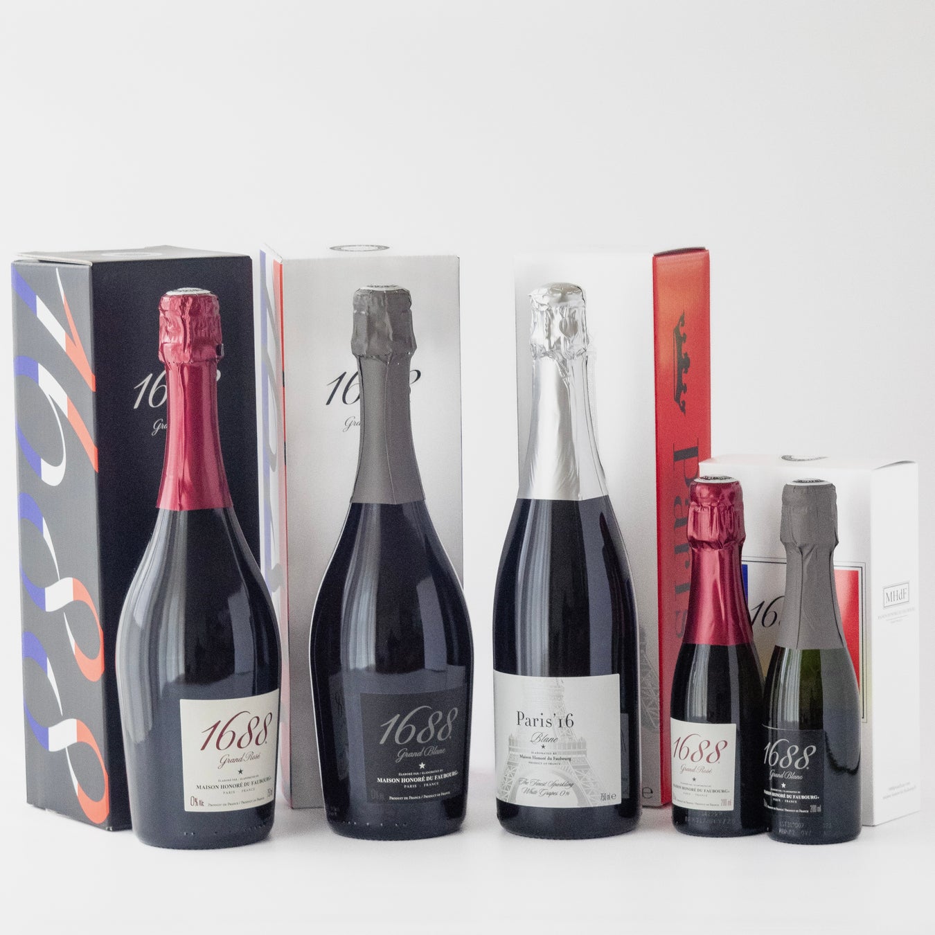 スタンダードの1688とParis'16の750mlの化粧箱は、黒と白が基調。200mlのペアセットは4種類のレパートリーがあります。 その他、2024年新登場のトリコロールBox(写真下)はフランス国旗の青と赤が配色されています。
