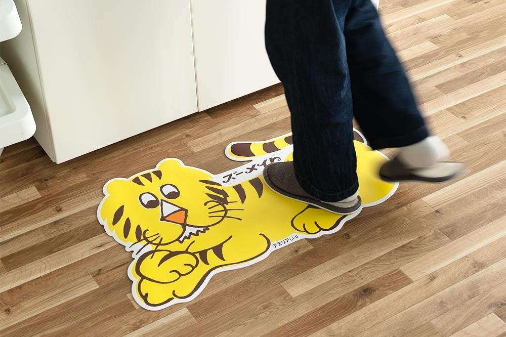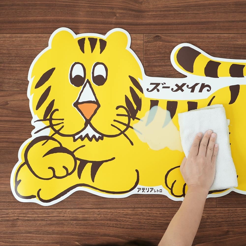 とぼけた表情がキュートなトラのキャラクター「ズーメイト」。キッチンマットと同じ、水拭きできる素材でさまざまなシーンで活用できます。